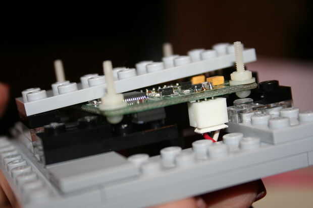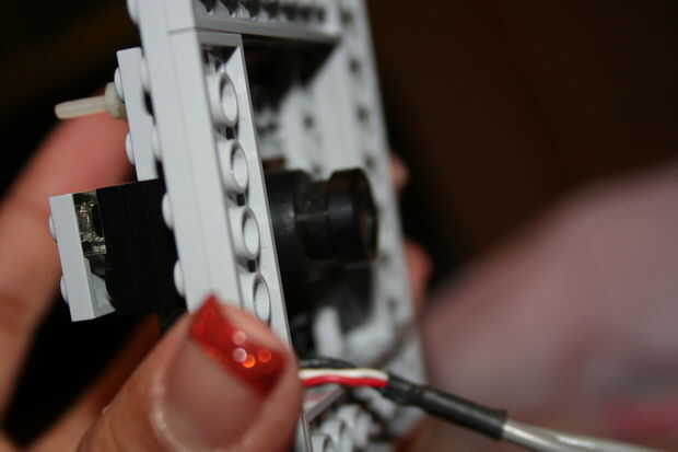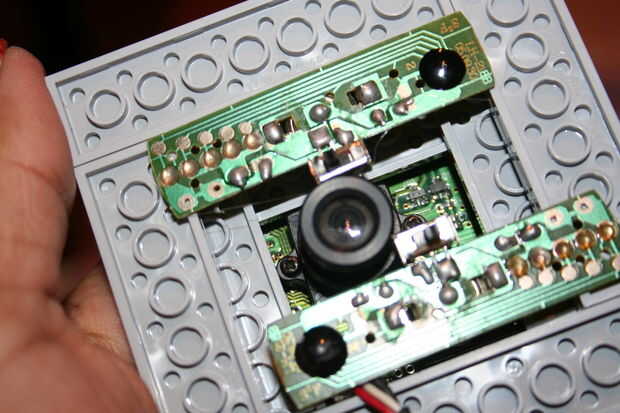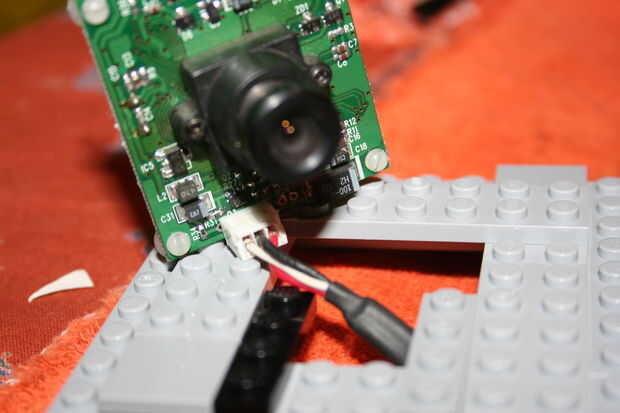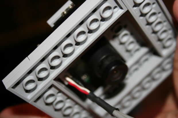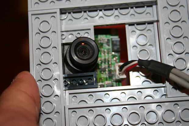 Usando los legos, construido un marco que pueda soportar la pequeña cámara. Construir el marco hacia fuera para que pueda sentarse en la parte superior la abertura en la caja sobre la pantalla.