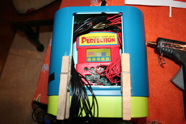 Utilizando una pistola de pegamento caliente Coloque los clips de la línea de dos ropa a los lados de la abertura en la caja por lo que puede acortar el marco lego construido sobre la caja.