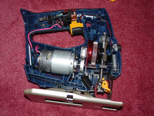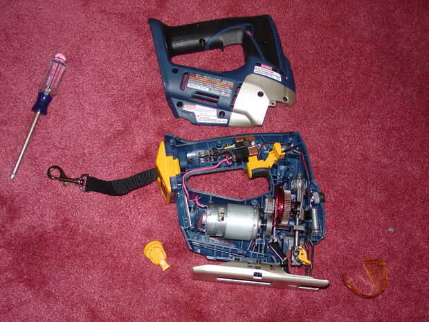 En primer lugar, debe quitar la cubierta frontal en la Sierra de vaivén por levantándola de un lado y desenvolverlo. Hay sólo un post a cada lado que va en el cuerpo de la sierra para mantener. Esperemos que hace falta decir que usted necesita quitar la batería de la herramienta antes de realizar cualquier otra - si se trata de una revelación, realmente quiera reconsiderar este instructable. Entonces todo lo que necesitas hacer es Desenroscar las dos mitades de la caja de la sierra con un destornillador Phillips. Cuidadosamente separe las mitades y asegúrese de realizar un seguimiento de todos los tornillos-estoy bastante seguro de Mina me alojé en el cuerpo cuando levantado hacia fuera. En la Sierra de vaivén de la puerta para la tienda de disco va a salir y tiene que colocarse cuando juntar las mitades del cuerpo de sierra otra vez ya que es sólo sostenido en lugar por las dos mitades se montan juntas.