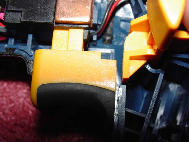 Una vez que el material se ha quitado del interruptor de seguridad, puede volver en la herramienta. Sólo tienes que configurar de nuevo en el cuerpo de la herramienta. Debe volver a instalar la puerta de lámina de almacenamiento jigsaw también, que debe ser el único punto de posible dificultad ya que tiene línea con ambas mitades del cuerpo. De lo contrario, una vez que las dos mitades del cuerpo están alineadas, apriete todos los tornillos hacia abajo y el aparato está listo para probar. Se puede ver en la imagen que ahora existe espacio entre el gatillo y el interruptor de seguridad. Mantiene el aspecto original de la sierra, pero la función, en mi opinión, es infinitamente mejor y más seguro de lo que era el interruptor de seguridad (ONU) intacto.