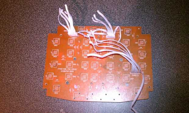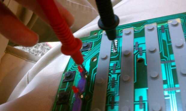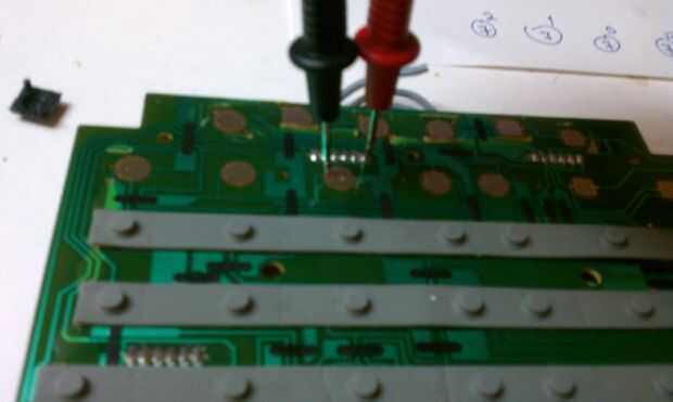 saqué los botones de goma del teclado PCB por lo que pude averiguar de cómo fue todo cableado. Para averiguar cómo está cableado a se utiliza un multímetro en la posición de medidor Ohm para comprobar la continuidad. Pongo un plomo en la fila de pines en el cable el vino fuera del teclado a los "cerebros" del juego y el otro en la parte metálica en la placa de circuito del botón para cada botón. Sólo usé una hoja de papel para hacer un seguimiento de qué botón fue a qué pins.