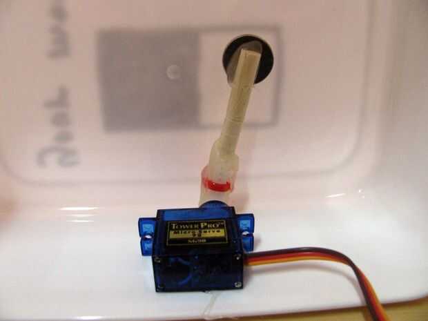 Aquí pegué servo en el interior de un contenedor caja de plástico para que el imán quede justo por debajo del "tablero" dibujado en el exterior de la caja.