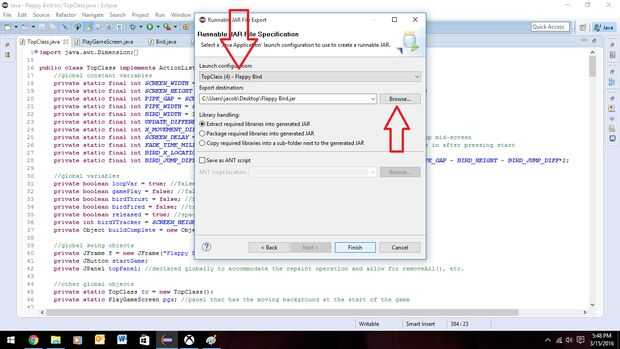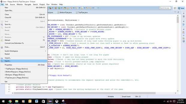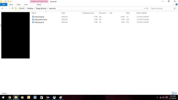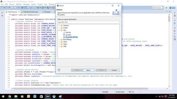 Ahora la parte fácil aquí: exportar el proyecto como un archivo JAR ejecutable. Cambiar el tipo de archivo de .jar a .zip. Navegar en el archivo zip y crear una carpeta llamada "resources". Dentro de esta carpeta, las imágenes de tres recursos utilizamos el depósito (o su propia): "blue_bird.png", "tube_bottom.png" y "tube_top.png". Cambiar el tipo de archivo a. jar. Usted debe ser capaz de ejecutar tu juego ahora!