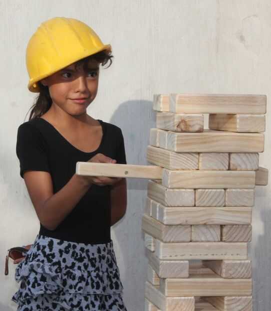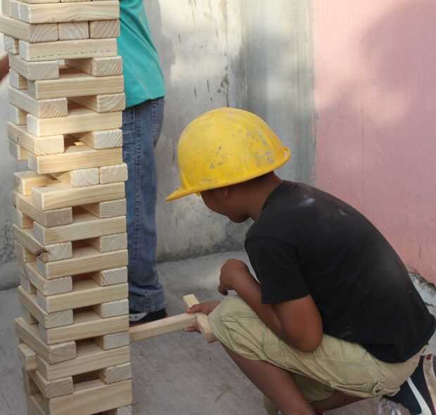 El último jugador colocando un bloque estable sobre los triunfos de la torre.