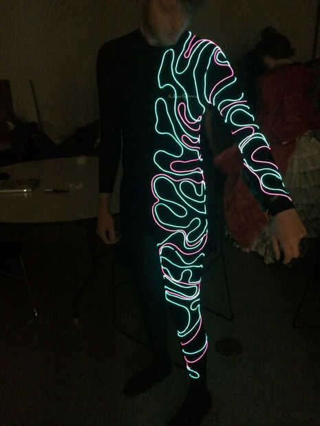 Aquí está una foto de la mitad de mi traje terminado. Cuenta con dos colores diferentes que se le atribuye y cerca de 100 pies de cable cosido en. Yo estoy cerca de 30 horas en coser aquí y todavía tienen otro todo medio para ir. Para la otra mitad su básicamente lo mismo al poner en los inversores y las luces.