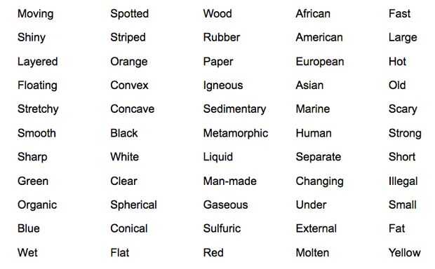 Con esta lista, debe ser posible describir cada elemento en la lista de vocabulario de Geología. Hay algunos extras que podrían sacar, pero quiero ver cómo los niños utilizará en clase. Si usted está preocupado por abrumadora su clase con opciones, deje caer los que no son esenciales. Con algunos experimentos, debe convertirse en claro que las palabras son extrañas. Pecar de demasiadas opciones, aunque, como no dejará varada en el frente de la clase sintiendo vergüenza mientras la gente desesperadamente buscando una palabra que decidió no era importante. Su millaje variará según el grado, el tamaño de clase y su experiencia con el material. Enseñé a Inglés, no en la ciencia, así que mi relación de adjetivos vocabulario es un poco fuera de control.
