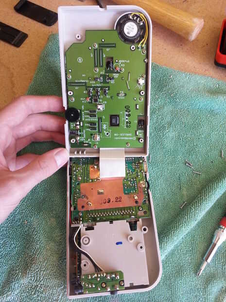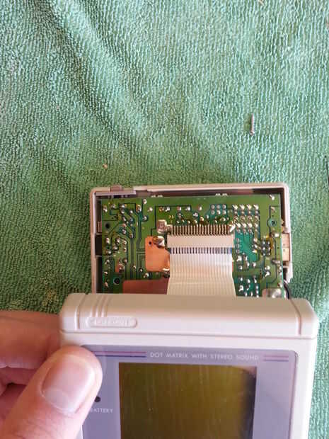 Siguiente paso es desmontar tu Game Boy. Hay 6 tornillos que sujetan a su Game Boy juntos. El tornillo puede ser cabezales philips regular, o puede que necesite obtener un destornillador tri-wing especial para tu Gameboy (necesita esto más adelante para el Wiimote, así). Una vez que usted retire cuidadosamente los 6 tornillos desconectar el cable de cinta que conecta las dos tablas principales. Simplemente se deslizan hacia afuera a la junta principal trasera.