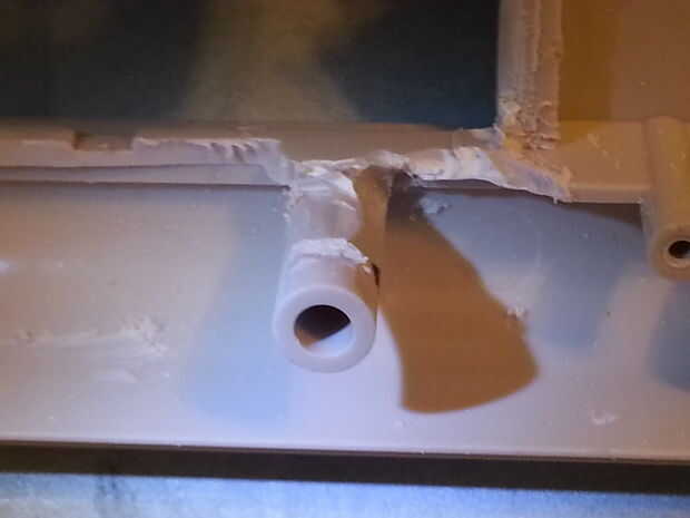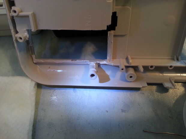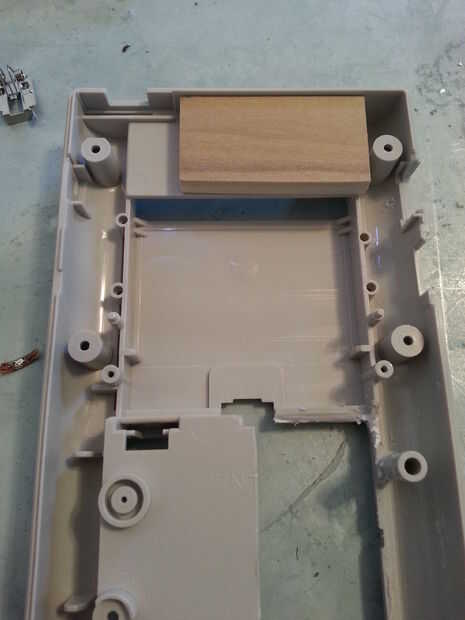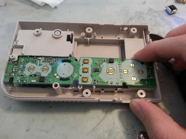Ahora corte una muesca en el poste que sujeta firmemente contra la parte frontal la parte posterior del circuito del gamepad. Esto también mantendrá el circuito del Wiimote en su lugar.