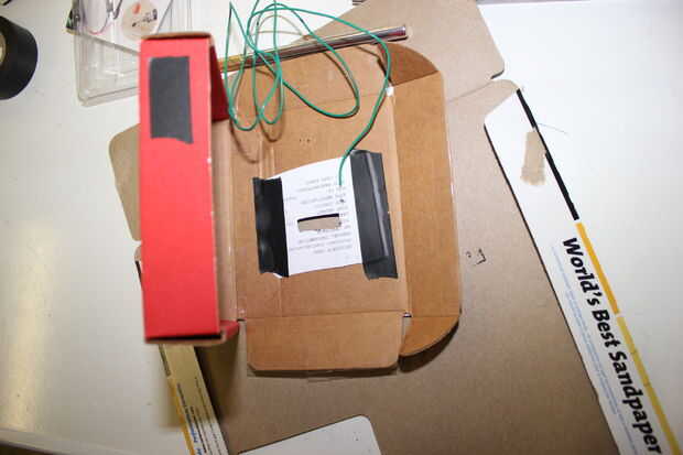 Se voltea el papel y la cinta a la caja para que la pintura conductora está mostrando a través del orificio.