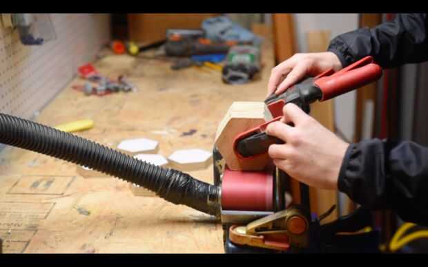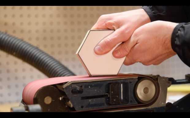 • Dejando el hexágono de papel en cada pieza, utilice las líneas negras del hexágono para cada lado hasta el mismo tamaño de la arena
