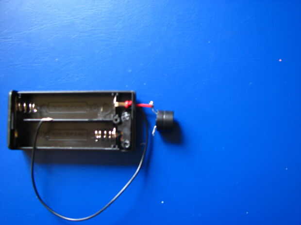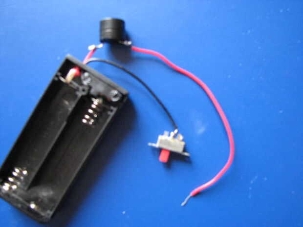 1. soldadura zumbador + caja de batería +. 2. Tome el cable de 5cm y de soldadura a un zumbador. 3. soldar un interruptor a la caja de la batería. 4. Tome el cable de 20 cm y soldadura a un interruptor.