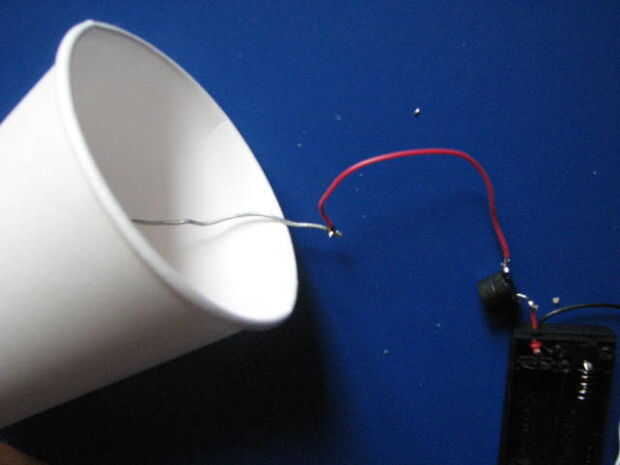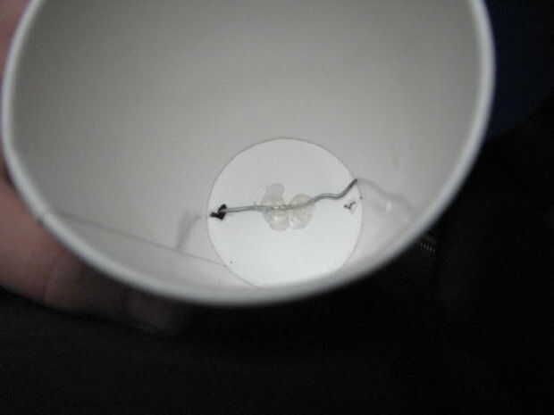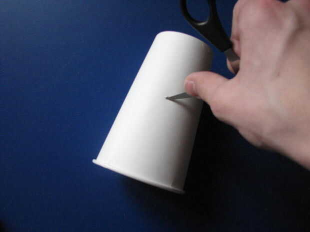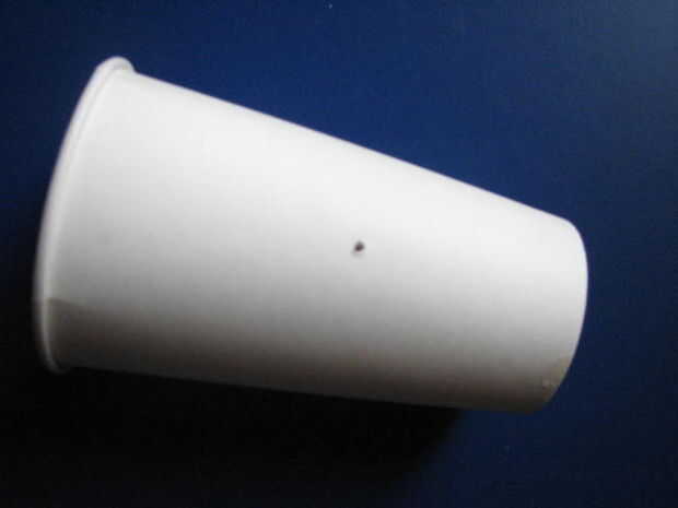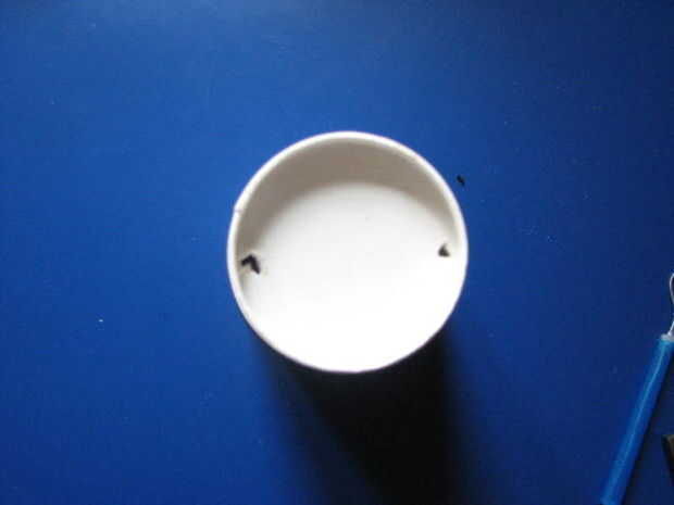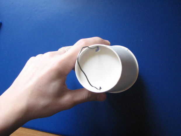 2. hacer 2 orificios en la parte inferior de la taza para alambre duro.