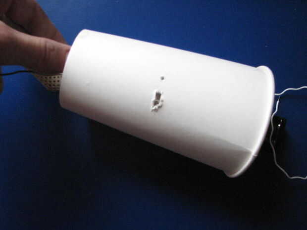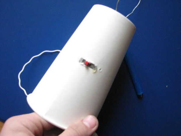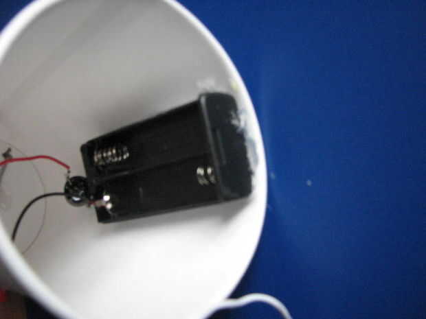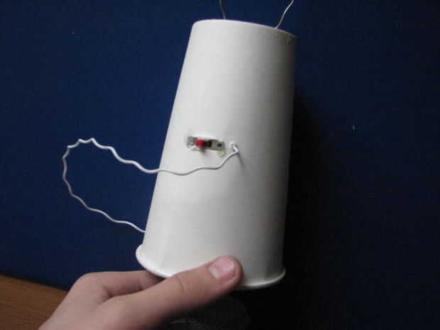 1. hacer un agujero para un interruptor en un lado de una taza. 2. ponemos un interruptor en un agujero y péguelo caliente. 3. pegamento la caja portapilas. 4. sacar un cable desde un switch a través de un agujero.