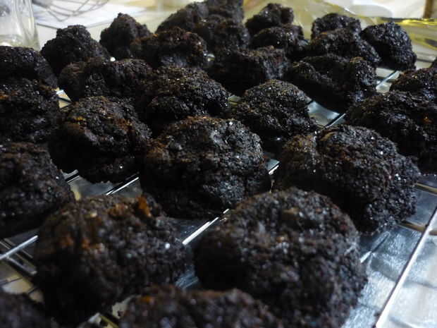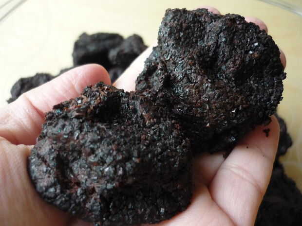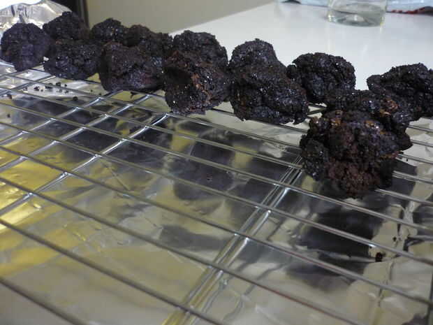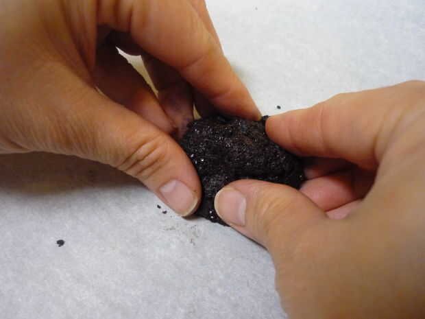 Dejan enfriar durante un minuto o dos, entonces muy cuidadosamente (pueden estar calientes!) prueba si eres capaz de exprimir suavemente y darles forma en tamaños desiguales, irregulares que se asemejan a trozos de carbón.