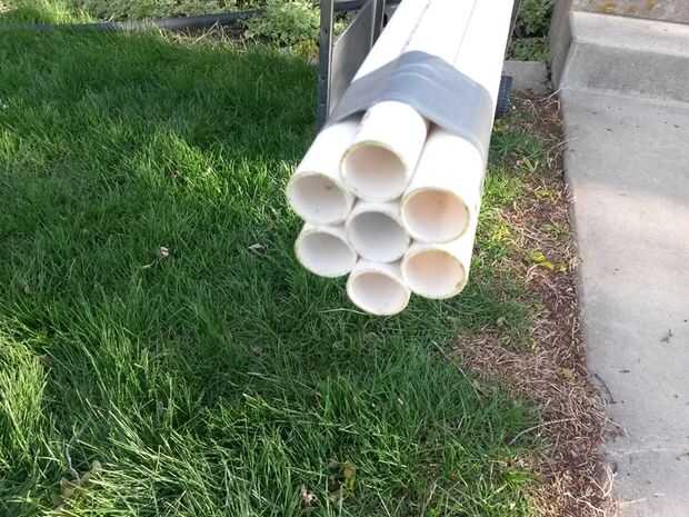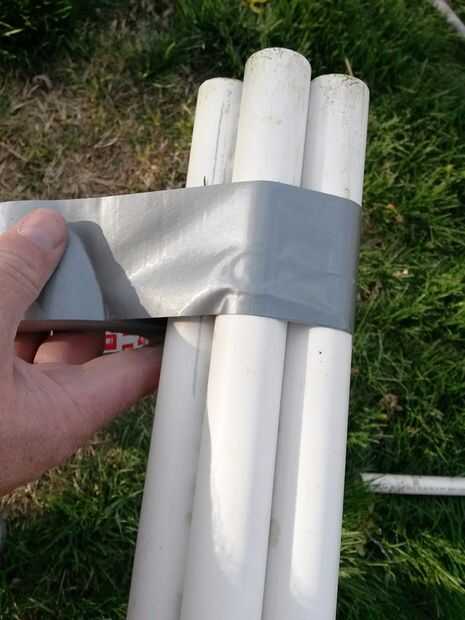 Luego hice versión un poco más ligera para los niños utilizando tubería de PVC. Tomé siete 10 pies, 1/2" tubos. Añadiendo un trozo de cinta a la tubería del centro con un abrigo medio agregando otras pipas alrededor de él y envolviendo la cinta alrededor del exterior y les vinculantes todos juntos.