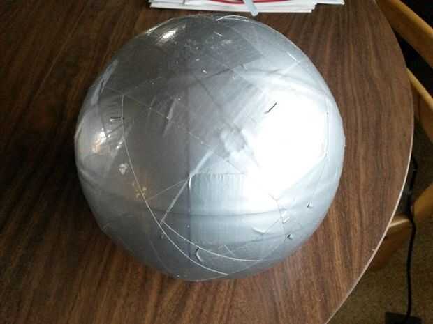 La pelota ahora tiene 8 secciones triangulares sigue mostrando. Luego envuelve la cinta desde el punto de un triángulo abierto a un punto más bajo del triángulo vecino continúan totalmente alrededor traslapará con el extremo de la cinta de 2 pulgadas. Luego hizo lo mismo con los otros puntos. Entonces envuelto dentro de áreas lo que todavía fueron descubiertas por la cinta hasta que la bola entera estaba cubierta.