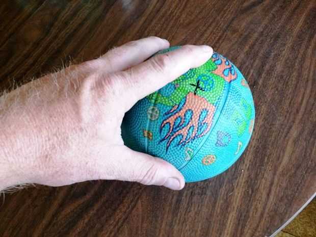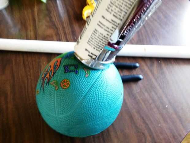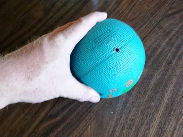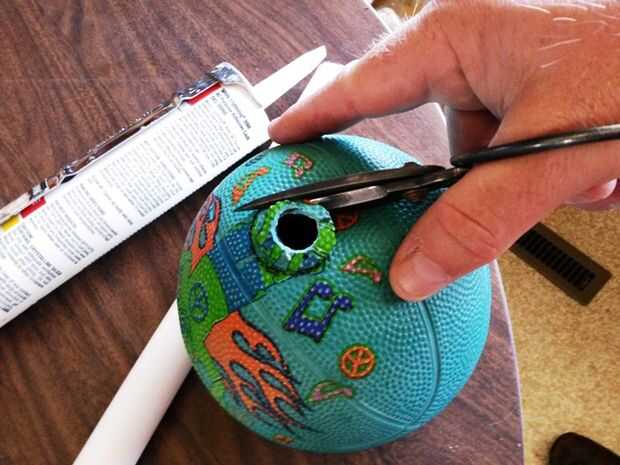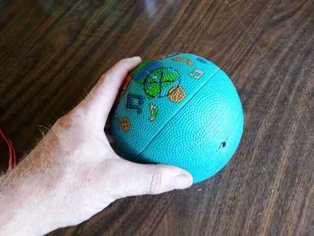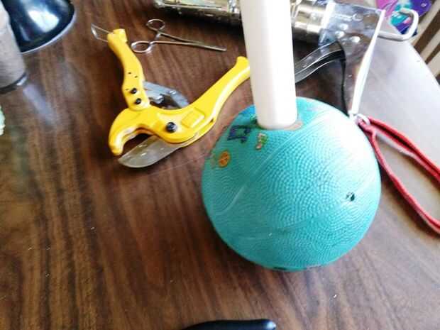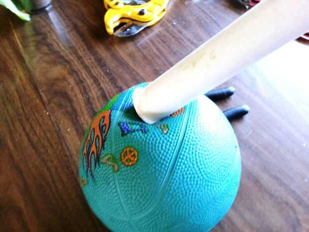 Entonces tuve la idea de utilizar una pelota más pequeña que también sucedió ser una mini baloncesto, rellenar con masilla de silicón alrededor de un asa central. Esto le dan peso y permiten cierta elasticidad en caso de que golpee a nadie.