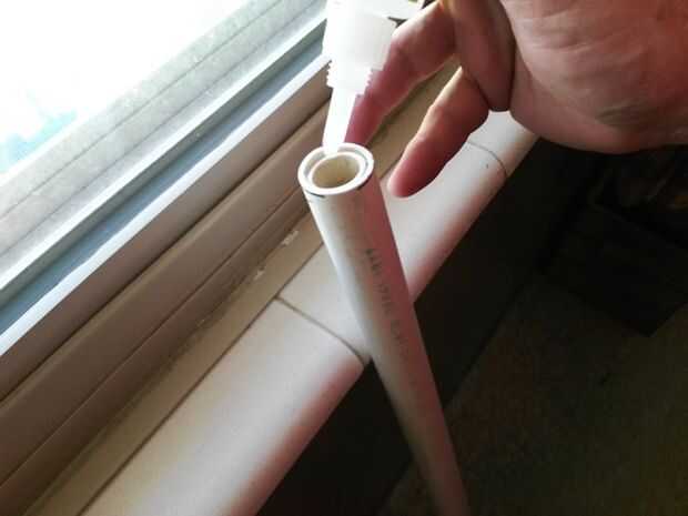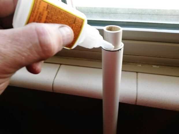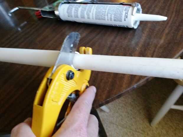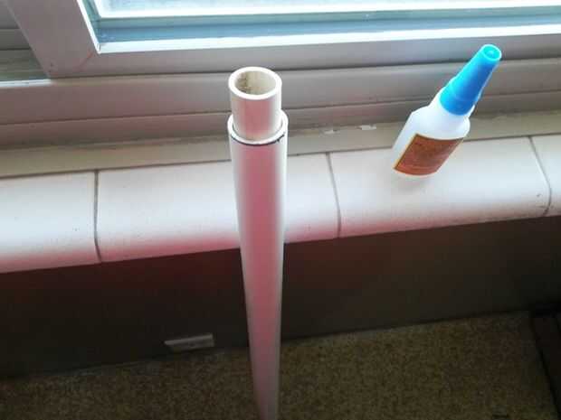 Mientras la masilla junté el mango. Yo sabía que el mango tendría que tener un poco más de fuerza pero todavía tienen algunos flex que. Decidí usar dos tubos de PVC, uno dentro del otro para mantener la flexión del PVC pero doblado para arriba para un poco más de fuerza. Se deslizó el 1/2" tubo dentro de la tubería de 3/4" y corte el tubo de 1/2" que fue un poco más, a la misma longitud. Consiguió el pegamento gorila confianza y sacó el 1/2" un poco, corrió pegamento alrededor y sobre todo los extremos y deslícelos juntos. Luego pongo una dosis pesada de pegamento alrededor del extremo para sostener todo y ponerlo a un lado para secar.