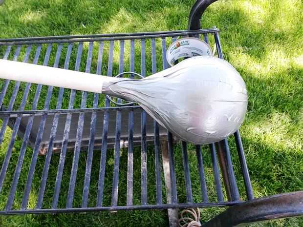 Ahora para el plan B. Utilicé tiras de cinta adhesiva para ejecutar desde 2" hasta la manija alrededor de la bola y hacia el otro lado de la manija. Lo hice otra vez y otra vez entrecruzados sobre el extremo de la bola hasta que fue totalmente cubierto entonces envuelto alrededor de la manija y cinta termina para curvas cerradas 3-4.
