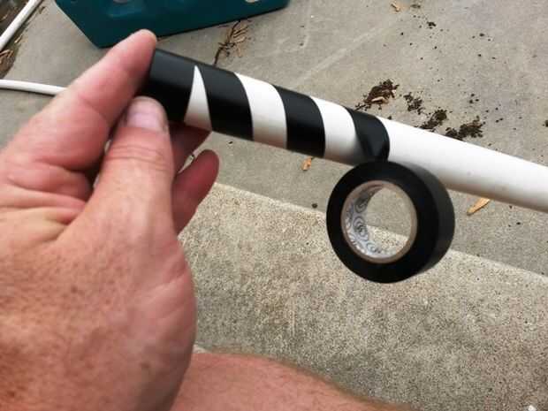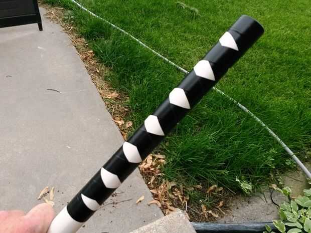 Para terminar hice Bolero limitada en el mango. Los reales no tiene ningún abrigo pero los lanzadores utilizan campo de pino para obtener un buen agarre en él. Como no estar usando tono quería un abrigo ligero para dar un poco más agarre a la manija de una tubería de PVC de slick. Me aseguré que no había ningunas rebabas en el borde del corte entonces comenzó a envolver alguna cinta aislante en el mango y luego terminando dejando un espacio entre la envoltura previa y la actual sobre la anchura de la cinta sí mismo. Una vez llegué hasta el final de la zona a ser envuelto, hice una envoltura completa en el tubo y comenzó a envolver hacia abajo. Lo envuelve el patrón hecho dejó la aparición de diamantes en el mango. Cuando llegué al final del mango hice dos vueltas completos y corte la cinta.