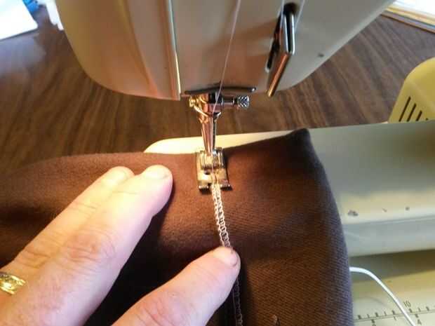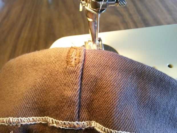 Coser la cinta a lado se alinea con las marcas hechas en los bordes cuando la pierna fue aplanada con el extremo alineado con la marca que acaba de hacer. Coser por el extremo y la cinta cerca de 3 pulgadas, cruzar la cinta al otro lado un par de veces y coser un patrón de 'x' junto a ello, y luego hacia abajo el lado opuesto a donde empezaste y coser otro 'patrón en el final de x'.