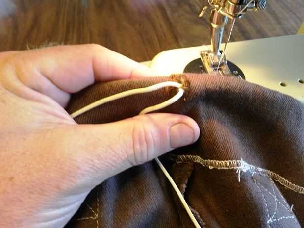 Doblez en el extremo y marca se quiere poner un tubo en la parte superior de la misma para una cadena de empate. Una vez que se hacen las marcas de coser un ojal al lado que será dentro de la envoltura y aproximadamente 1/4" abajo de las marcas. Doble esta pieza y coser en el borde para formar un tubo por un extremo. Pase un cable por el agujero del botón, a través del tubo, alrededor de la abertura y vuelve a salir del agujero de botón. Poner la bola en la pierna y dibuja el cable firmemente, tensar el material en el otro extremo y asegúrese de que se toque y marque la longitud a cortar cualquier material adicional.