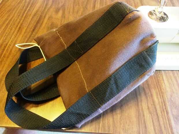 La idea era todavía sana pero la máquina de coser no le gustaba el material de cordura que tenía un forro de goma a él. Pero con la idea básica en mente encontramos una pernera de unos pantalones que habían sido repurposed y que todavía se utiliza la cinta de las manijas del bolso. .