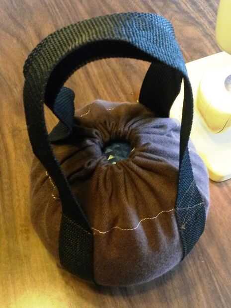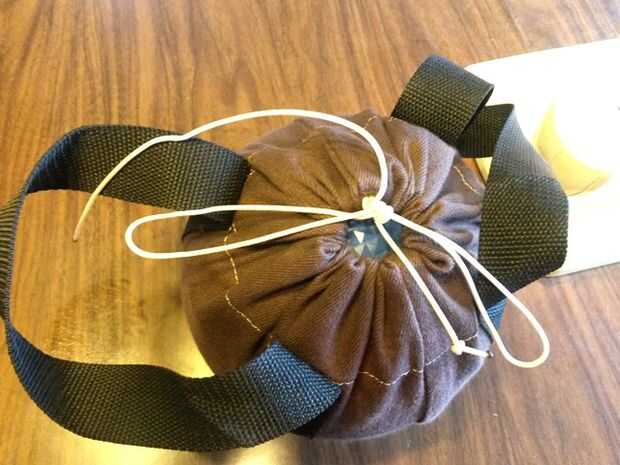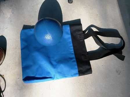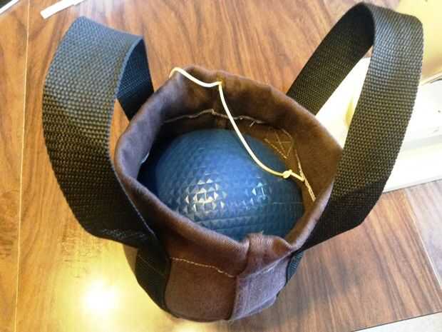 A partir de una bola ponderada, pequeña bola de medicina o entrenamiento suave peso encontré una de esas bolsas de regalo que dan en las conferencias de dos secciones de correas de nylon y cordura. Estos pueden encontrarse en muchas tiendas de segunda mano por un dólar. Así que para un dólar tengo suficiente material para hacer un envoltorio y bastantes correas de nylon para agregar dos controladores fuertes.