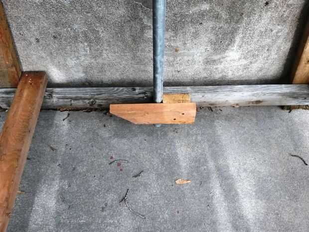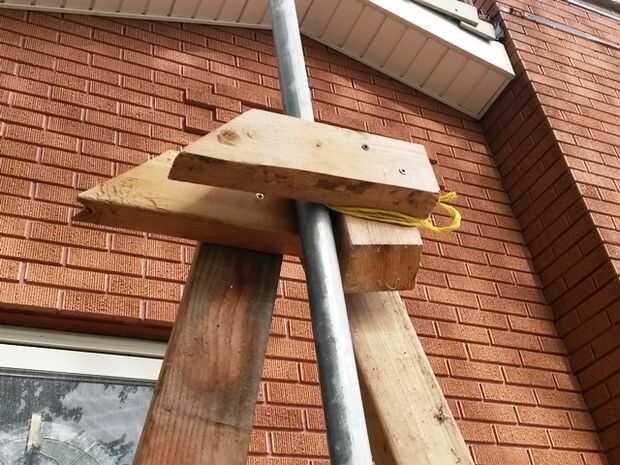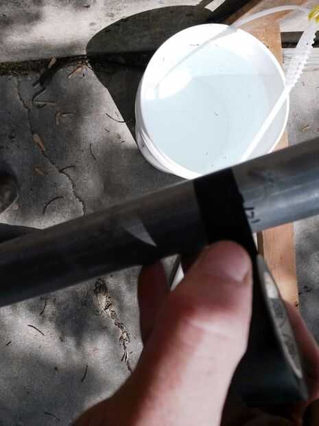 Levantar la tubería en los soportes y atado en su lugar. El marcador de altura se agrega a los tubos. Es una longitud de cable amarillo que se aprieta con una cuerda del amortiguador auxiliar a un lado. El amortiguador auxiliar también ayuda a sujetar el tubo para sujetar en su lugar. El marcador puede ser levantado con una sección de tubo de PVC.