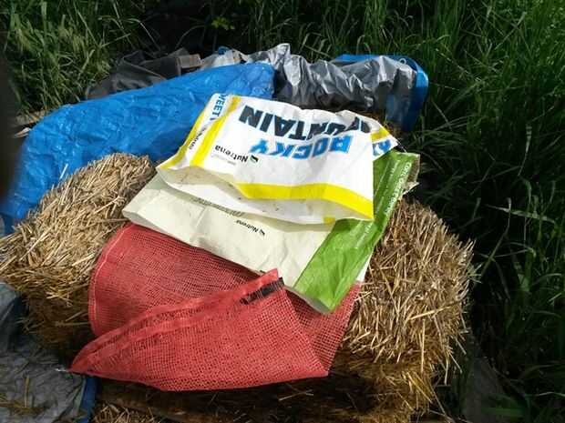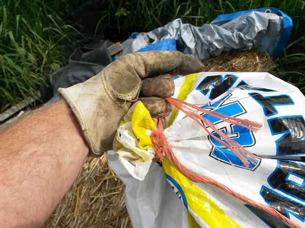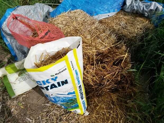 Usé la paja en mi y había añadido grandes puñados a la bolsa hasta que estaba llena. Mullida la paja hacia arriba un poco y agregó que no había nada en que hace daño a nadie. Prensas de heno/paja recogida, elementos extraños a veces y siempre es bueno comprobar lo que podría ser dentro de un fardo al usarlo.