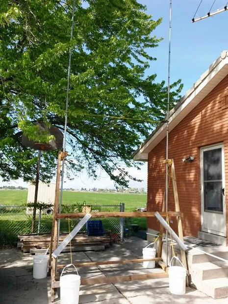 Hice una torre de reciclado 2 "x 4"s y algunos tubos de riel superior de un proyecto de cadena enlace valla que alguien era tirar de repuesto. Dos carriles de alta darán una torre un poco más alta que 20'.