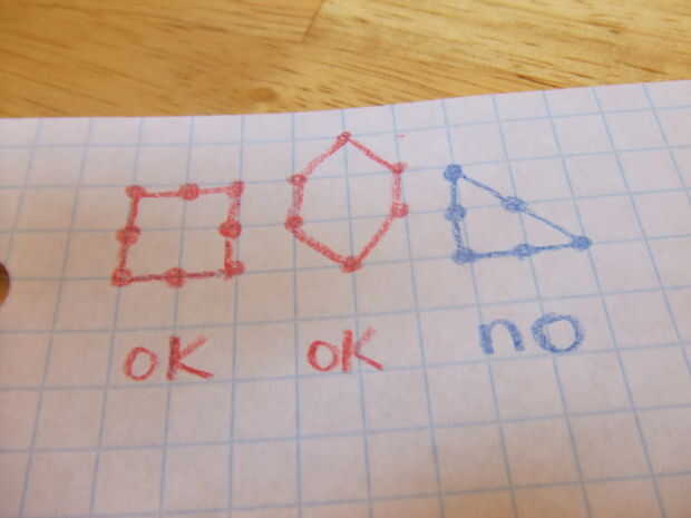 En este juego, tienes a red una forma echada a un lado 4 o más. 3 formas de caras son ilegales en este juego, porque hará que el juego caótico. También, los puntos tienen que ser de lado a lado, directamente vertical, o directamente diagnol.