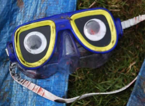 El antifaz se hicieron tomando pares de gafas de buceo (forma un par la tienda de la libra y uno de una venta del revoltijo) y ennegreciéndose utilizando pegajosa con el respaldo de plástico (vinilo). Agregué ojos saltones en el exterior; como todos saben, todo es mejor con los ojos saltones...