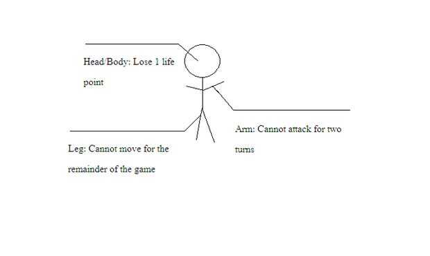 Ahora, dobla el papel hacia arriba y manténgalo bajo una luz. Si la marca que usted hizo es en una cabeza o cuerpo de los opositores, el oponente pierde un punto de vida. Si golpea los brazos, no atacan para las siguientes dos vueltas (Marcos por garabatear su brazo, o algo al efecto). Si golpea su pierna, no se puedan mover durante el resto del juego.