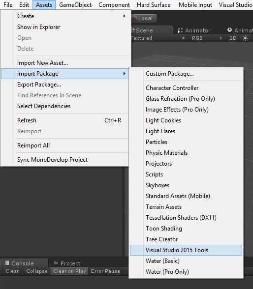 Y cambie de Mono desarrollar a Visual Studio. Y ahí lo tienen! Una pequeña salvedad. En cada proyecto nuevo se crea necesidad aún de ir a activos > Importar paquete > Visual Studio Tools y luego confirmar la importación.