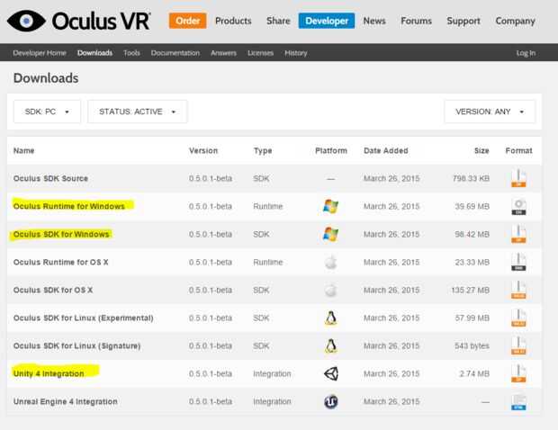 En primer lugar, tenemos que agarrar las piezas de Oculus de su sitio. Usted puede ir a su sección de descargas. Ahora si tienes un Mac o un Linux, descargar los enlaces apropiados para esos sistemas operativos.