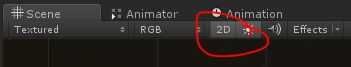Seleccione la interfaz de usuario de inicio de la jerarquía y seleccionar el botón 2D en la pestaña de escena. En general es más fácil trabajar con la interfaz de usuario en el modo 2D de la unidad.