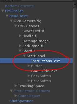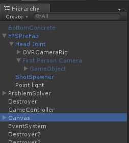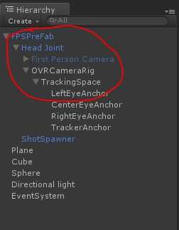 Ahora en nuestra escena principal, añadir la OVRCamerRig a la FPSPreFab como lo hicimos antes. Ahora necesitamos añadir que una interfaz de usuario para el Oculus porque el oculus no puede utilizar HUD muestra la misma forma que puede regular las cámaras de la unidad. Para ello copiar el objeto Canvas y pegarlo debajo de la OVRCameraRig y cambiar el nombre de la OVRCanvas de lona.