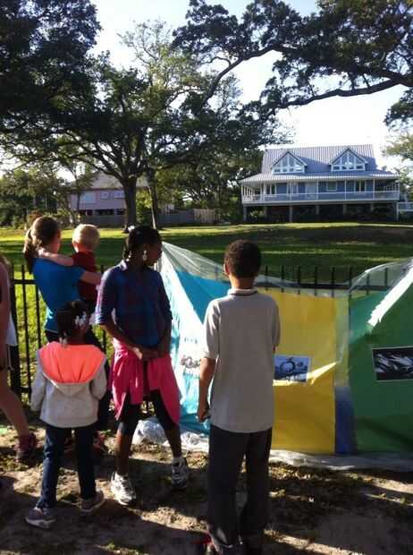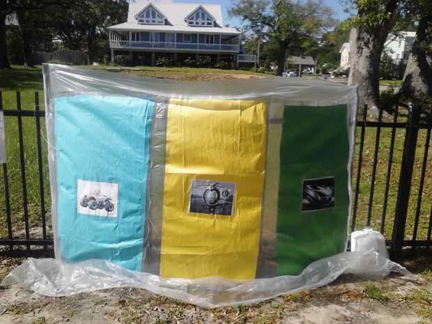 Cuando llegamos al parque, nos extendió nuestra pared de puertas y atascado al final de las varillas de metal en la tierra como estacas para sostener contra una valla para que los niños no podían mirar detrás de él. Almacenan todos los regalos robados detrás de él contra la guía. Quería que todos los regalos que está escondido detrás de la puerta derecha pero hice demasiado pequeño y había muchos regalos para que vieran los regalos a través de las partes claras de la lona entre las puertas. Se dice a los niños que no importaba y que necesitaban la puerta que el villano.