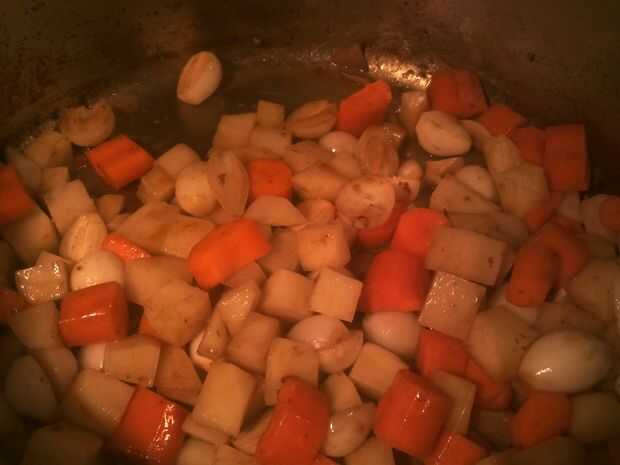 Poner las zanahorias y cebollas. Cocinarlas hasta que totalmente cocinados y tiernos.