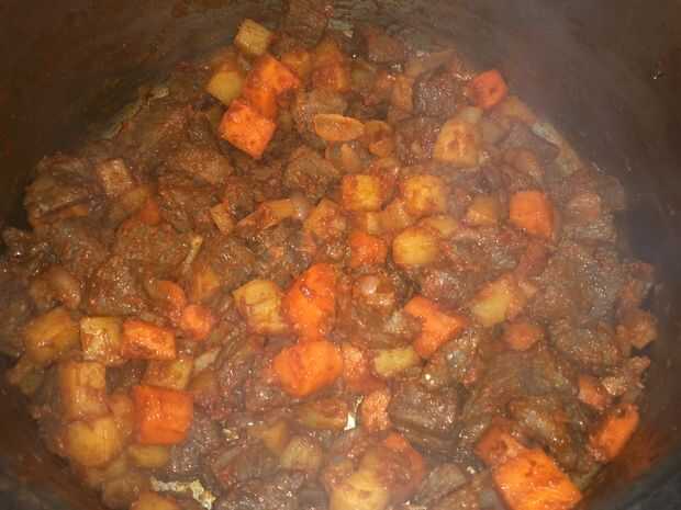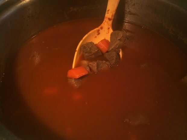 Vierta el caldo en la olla, agregar suficiente para cubrir la carne y las verduras (la cantidad real depende del tamaño y forma de la vasija). Cubrir con una tapa. Gire el calor a medio-bajo.