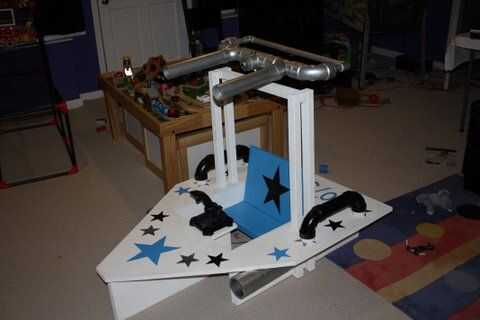 No puedo decir esto es lo primero que he desarrollado, pero a los niños, fue el más importante. Llamé a Ben mi Consultor creativo. Esto es lo que se nos ocurrió dado el montón de restos de madera en mi tienda. Lo no se ve en esta foto es el paso en la parte posterior que permite una de 5 años a una altura cómoda para operar correctamente el cañón de fotones. En frente funciona el joystick por el piloto. El joystick permite giro izquierda y derecha así como movimiento hacia adelante y hacia atrás. El gatillo dispara misiles guiados si todavía los tienes, pero voy a en más detalle en los cuando cubre el desarrollo de software.