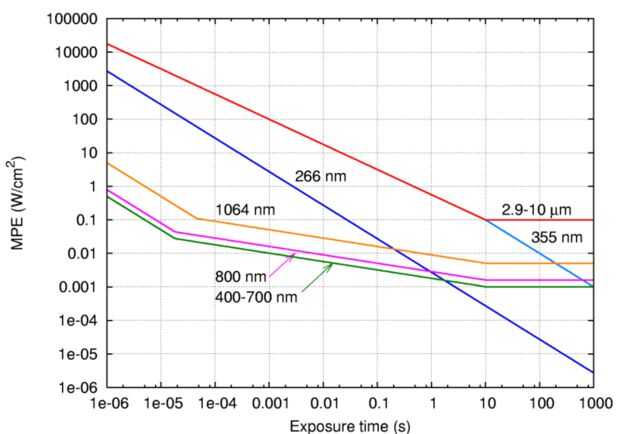 Esto nos pone en el tiempo de exposición .001S si nos atenemos a su ojo en el frente del laser (crece en el área de la parte delantera del láser, por lo que disminuye en intensidad), y el tiempo aumenta mucho el rayo diverge hacia la pantalla (donde el área es de. 8cm ^ 2 y el número de energía que utiliza es.006. Nota que este número es para clase 1 MPE, que significa que es 10% de la dosis a la que tiene un 50% de posibilidades de incurrir en daños.