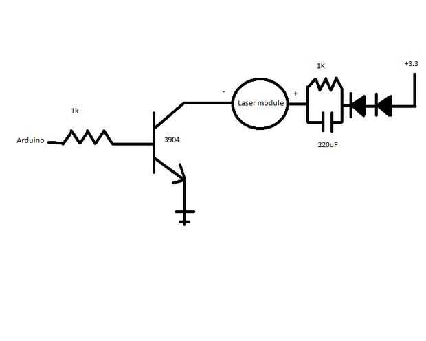 Figuring out el joystick no es ningún misterio, es solo un barato USB joystick enchufado en mi cine en casa PC con un cable de extensión USB (fue 15' cable y tiene un concentrador USB integrado en el extremo funciona como un repetidor). El cañón de fotones es despedido por un simple botón en la parte posterior (usted puede tenerlo pulsado para disparar a una velocidad de 5 disparos / segundo) y el punto en la pantalla donde ver naves espaciales alienígenas! ¿Pero cómo recoger el cañón de fotones montado torrecilla? Los lasers. Decidí usar un láser infrarrojo. Si decides ir por este camino, recuerde mantener la energía de su láser muy por debajo de niveles seguros de ojo, según lo definido por la FDA. Esto es algo extraño, pero un láser invisible se considera ojo seguro 10% de la dosis en que la persona promedio representa un 50% de posibilidades de incurrir en daños en todo. Usé un arduino para cambiar el botón disparador a un pulso de láser de 5Hz, limitado a 1 ms en. Yo también limitada la potencia de salida de mi láser con el circuito siguiente (haga clic en la imagen adjunta debajo de éste). Esto es para garantizar que incluso en el caso de una falla, el láser no puede atascarse en la posición ON. Quiere esto porque, a diferencia de un láser rojo, un láser de infrarrojos es invisible y no puede decir que se supone que parpadean si uno brilla en sus ojos. El láser que estoy usando es un módulo de láser de 5mW IR ordenado de digikey.