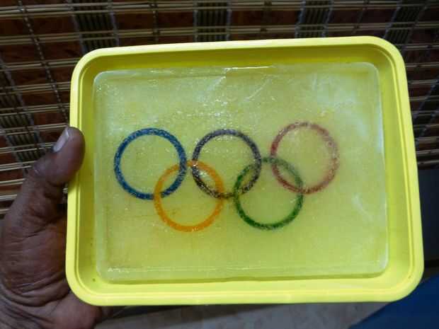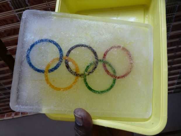 El símbolo olímpico congelado en el hielo está listo para la exhibición