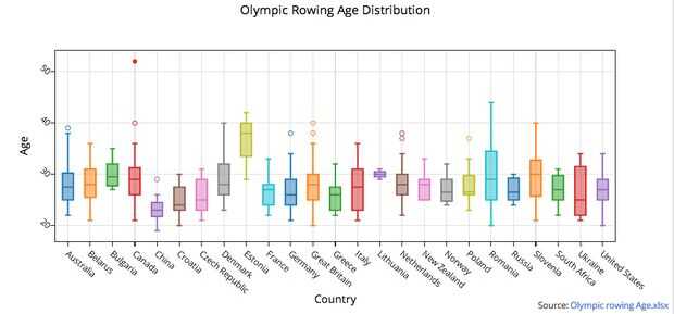 Remo es muy unigue que muchos o los atletas no pico hasta su finales de 20 s 30 temprano. La edad promedio para todos los medallistas en remo tiene 27 años, con el ganador de la medalla es tan antigua como 52 y como joven como 19 o 20. Las distribuciones también son muy diferentes entre países, con ormain teniendo una gran extensión, en comparación con países como Noruega y Nueva Zelanda que están más centradas en el 27, gama de 28 años.