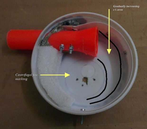 b. Marcar zona de tal manera que la brecha de contenedores entre el ventilador centrífugo y el tubo plástico tiene un área transversal aumentando gradualmente para más acumulación de la presión como se muestra en la figura siguiente. Es un poco engorrosa de desmontar el tubo y la espuma. Por lo tanto, se incluyen en la instantánea así.