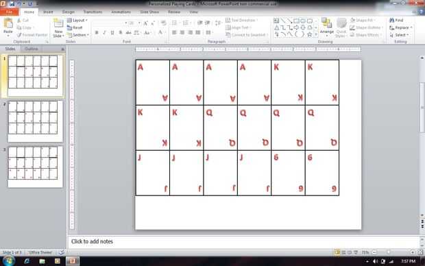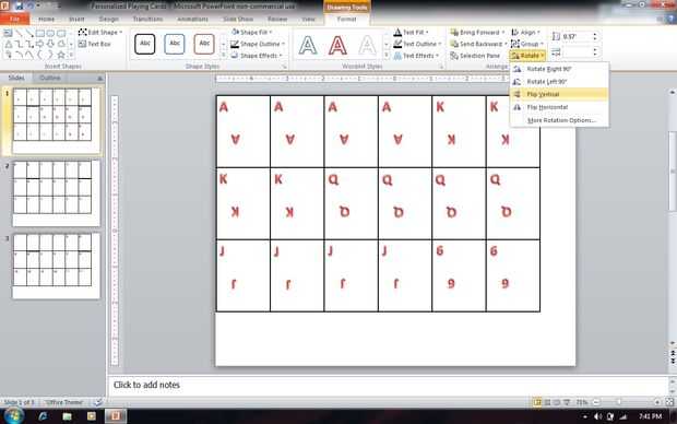 Seleccione todas las letras en la página pulsando la tecla "shift" y copiarlos. Pegar las letras en la pantalla. Mientras el nuevo juego de cartas está todavía seleccionado , haga clic en formato / girar / voltear Vertical. Mover las letras giradas a la esquina inferior derecha de sus respectivas tarjetas.