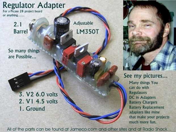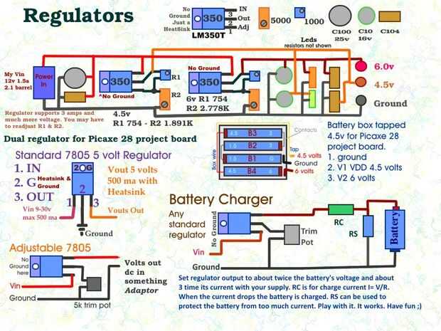 Mi adaptador de batería para mi Junta de proyecto Picaxe 28 hice el diagrama del circuito tan simple como sea posible porque el regulador de 350 se parece a ningún otro regulador. No enganche el pasador del disipador de calor 2 a tierra. Utilizar un disipador térmico si es necesario. Puede que deba reajustar las macetas Si utilizas un voltaje más alto. El 350 es un regulador de 3 amperios por lo que se puede utilizar una corriente más alta también. Este tipo de adaptadores que robots y cosas fáciles de jugar con. Dejé las macetas en que podía usar mi adaptador para otras cosas. Todas las piezas están disponibles de Jameco.com y otros sitios y más en Radio Shack.