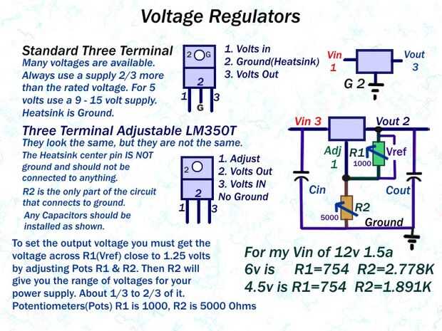 Reguladores ajustables tienen el mismo aspecto como cualquier otro regulador, pero no son lo mismo. Lea la documentación. No tienen ningún conector de tierra. El perno de centro 2 y el disipador de calor no son de tierra y no deben conectarse a cualquier cosa. En regulador LM350T 3 amp R2 sólo se conecta a tierra. En el circuito R1 conecta a voltios y a pin 1(Adjust) y R2 conecta pin 1(Adjust) y a la tierra. Se establece su voltaje de salida de ajuste R1 y R2 hasta llegar cerca de 1,25 voltios a través de R1. Luego R2 le da el rango de tensión de su regulador con su fuente. Puede ser divertido para que funcione si tu fuente de voltaje o corriente es demasiado baja. Mira mi R1 en 754. R1 gama depende de cuán grande es la diferencia entre su alimentación y su tensión de salida regulada. Ver las fotos.